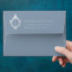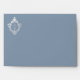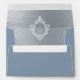 Une enveloppe élégante avec une initiale monogramme dans une crête vintage de tous les côtés. Il est bleu poussiéreux à l'extérieur et faux feuille d'argent à l'intérieur. La crête vintage est aussi un faux papier argenté. L'adresse de retour est imprimée sur le rabat, avec le monogramme en crête à gauche. Le monogramme comporte les 2 initiales de la mariée et du marié séparées par une ligne.