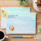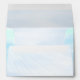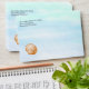 Belle enveloppe faire-part de mariage en bleu et en eau, avec une plage de sable, aux coquillages, sur le rabat arrière. Une coquille solitaire orne l'avant de l'enveloppe. L'adresse de retour de texte de script noir est prête à être personnalisée pour votre mariage de thème de plage.