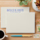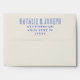 Une enveloppe mariage rétro moderne écrite à la main et colorée. Ce qui présente les noms de mariée et de marié en gras en bleu. Et adresse de retour personnalisée. Sur un simple arrière - plan couleur beige crème. Ce qui convient à toute la suite mariage.