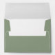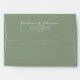 Une enveloppe minimaliste de mariage boho chic sauge. Ce qui est simple couleur vert clair. Avec la calligraphie manuscrite blanche des prénoms de la mariée et du marié ainsi que l'étiquette d'adresse de retour personnalisée. Et informations personnalisables sur l'adresse de retour..