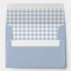 Le pays de charme en vichy dans un bleu et blanc pâle et poussiéreux borde l'intérieur de l'enveloppe de faire-part de mariage bleu pays. Les graphiques d'un ruban en vichy bleu et blanc s'affichent au bas du rabat arrière, et le texte de l'adresse de retour blanc, sur le rabat, est prêt à être personnalisé. Produits de mariage chic en vichy pays correspondants disponibles.