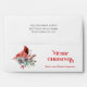 This festive Christmas envelope exudes cheerful holiday spirit with its vibrant liner of diagonal red, green, and white stripes—a classic palette that instantly evokes candy canes and cozy winter scenes. The envelope features a striking red cardinal perched gracefully on a cluster of winter greenery, including eucalyptus leaves and bright berries, adding a touch of natural elegance. The greeting, “MERRY CHRISTMAS from our house to yours,” is rendered in a decorative red font that balances boldness with warmth, making the entire ensemble feel both traditional and heartfelt—perfect for spreading seasonal joy.