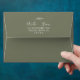 Cette enveloppe minimale de faire-part de mariage vert foncé feuille est parfaite pour un mariage boho. Le design se compose d'une simple silhouette de feuille de verdure en vert d'olivier, au style bohème minimaliste de montagne. Personnalisez le rabat d'enveloppe avec votre adresse de retour. Ces enveloppes peuvent également être utilisées pour une douche nuptiale, un dîner de répétition ou tout événement spécial.