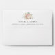 Ces enveloppes de mariage sobres et élégantes présentent des bouquets boho, rustiques de fleurs d'aquarelle et de la verdure dans des tons neutres de terre cuite et d'ivoire, sur un arrière - plan blanc avec une subtile aquarelle rousse.
