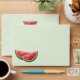 Le rouge et le vert de Destei à la pastèque en tranche de fruits illustrant une couleur arrière - plan verte claire. Une tranche de pastèque est également placée à l'avant et la couleur intérieure est rouge.