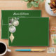 A green background. Personalize and add a name and your return address. The name is written with a modern and trendy handlettered style script. Christmas decor.