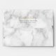 L'intérieur de cette élégante enveloppe de faire-part de mariage moderne présente une aquarelle bleue turquoise, décorée d'une parties scintillant en faux or. Customisez le rabat arrière avec les noms de la mariée et du marié en écriture manuscrite de couleur or et l'adresse de retour en police de cuivre noir sur un arrière - plan en marbre gris et blanc.