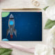 Célébrez l'anniversaire du garçon ou l'occasion spéciale avec ce vaisseau-fusée spatial cool dans l'espace. Ciel bleu foncé avec étoiles et planètes colorées, et une fusée argentée qui fuit dans le ciel. Coloré et lumineux. Tous les dessins et modèles Copyright © 2012 www.CustomInvitesOnline.com