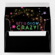 Enveloppe noire 5x7 brillante bordée d'étoiles brillantes et aléatoires qui ressemblent à de la parties scintillant dans des tons d'argent, d'or, de rouge, de rose et de violet. Lit 'Faisons la folie !' en néon, les lumières produisent des lettres bleues, vertes et roses. Des enveloppes jolies et festives pour des anniversaires sombres, des couleurs néons, des fêtes noires, des fêtes d'anniversaire pour les filles, etc. Nous avons une lueur de coordination dans les invitations de fêtes noires et les fournitures d'anniversaire de lumière noire dans notre boutique Zazzle.com/angela65*.
