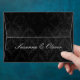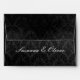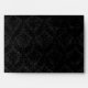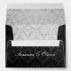 Cette enveloppe présente un somptueux damas gris et argent sur la doublure intérieure. L'extérieur est un design noir luxueux et texturé. Le design est légèrement déprimé pour un look vintage et charmant. Le nom d'un couple est écrit en blanc sous le rabat arrière.