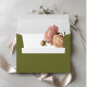Ces belles enveloppes de faire-part de mariage sont ornées d'une veste verte d'olive chic, tandis que l'intérieur révèle un blanc éclatant contrasté aux accents roses. Adresse de l'expéditeur à l'arrière et la zone doublée pour les adresses d'écriture manuscrite individuellement. Laissez la zone de texte vide si aucune ligne n'est préférée. CONSEIL : Utilisez un marqueur blanc fin pour les adresses manuscrites contre le vert olive. Vous pouvez également choisir de mettre des autocollants d'adresse dans la même collection.
