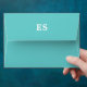 Palmier & étoile de mer tropicale enveloppe de mariage avec monogramme, avec un paysage tropical : un palmier avec noix de coco sur une plage de sable avec étoiles de mer, eau bleue mer/océan et le ciel avec le soleil et les nuages à l'intérieur. Idéal pour un été, tropical, mariage de plage. Bleu, vert, jaune, marron.