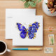 Bijoux, bleu, saphir, papillon aux fleurs pétillantes avec aile décorée de bleu, fleurs précieuses avec feuilles d'or sur arrière - plan blanc.