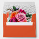 Orangé audacieux avec des roses lumineux et colorés. L'élément métallique artistique ajoute une touche de fantaisie, ainsi que l'élément ruban à l'avant droit de l'enveloppe.