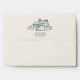 Hors enveloppe blanche avec émeraude à l'intérieur. Le rabat arrière présente une illustration vert émeraude de la grange et de l'adresse de retour.
