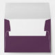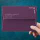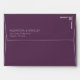 This wedding envelope features a sleek, minimalist design with a solid dark purple background. The layout is balanced and modern, showcasing centered text in a clean sans-serif font for the names and address, while a stylized handgun icon adds an unexpected graphic element on the right side. The monochromatic color palette enhances the sophisticated and contemporary feel of the design, making it perfect for couples looking to add a unique touch to their wedding stationery.