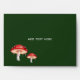 A watercolor illustration of red and orange mushrooms growing in a forest setting. The mushrooms have large, bright red caps with white spots and white stems. Multiple mushrooms of varying sizes are arranged around a central green space, creating a natural frame. The mushrooms grow from moss-covered tree roots and branches that wind through the composition. Green ferns and small plants with delicate leaves are scattered throughout the scene. The background features muted green and blue tones, with a darker olive green central area. The illustration has a soft, ethereal quality typical of watercolor paintings, with gentle color transitions and subtle texture effects. The mushrooms cast subtle shadows beneath them, adding depth to the composition. The artwork has a whimsical, fantasy-like quality with the mushrooms arranged in a circular pattern around the central green space.