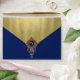 Elégante invitation en bleu royal et or et enveloppe spéciale faire-part avec joli flap en feuille d'or imprimé et intérieur en feuille d'or avec beau bijou en perle d'or et bleu royal au centre. Vous pouvez customiser cette belle enveloppe bleue et or royale en ajoutant votre adresse de retour, logo, etc., au rabat arrière. Il s'agit d'un design imprimé sans vrais bijoux, feuille, parties scintillant, etc.