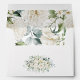 aménagement floral délicat avec des roses doux blancs et crème, des hydrangées et une végétation luxuriante, accentuée par de subtils reflets dorés. Les fleurs et le feuillage sont peints dans un style aquarelle, créant une esthétique élégante et intemporelle.