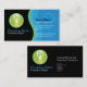This green, blue and black business card features a light bulb with leaves in the centre. This design represents an Eco friendly business.