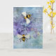 A digital collage of purple flowers with honeybees, shadows of a pansy bouquet, and the faint imprint of sheet music, on a blue and green marbled background, creates a beautiful and unusual Mother's Day card.