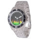 Has heft and feel of expensive stainless steel quartz watches. Good band with safety catch. I removed links, which is easy because engraved arrows show direction to push the linking pins. As always by this seller, the image (a railroad logo) is a perfect reproduction of my emailed image, and is precisely spaced and aligned.