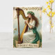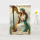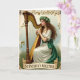 This card shows a graceful young woman leaning close to an ornate golden harp as if sharing a quiet secret through music 💚. Her auburn hair falls over her shoulders beneath a green floral crown, and an emerald sash draws in her flowing cream gown. With her fingers hovering over the strings and her eyes lowered, the pose feels tender and intimate, like she’s playing for someone standing just out of view. The harp gleams with carved details, and the words “ERIN GO BRAGH” appear across its body in dark lettering that stands out against the gold. Above her, a trail of golden notes and a curved music staff sweep across the upper area, adding a soft sense of motion ☘️. The background blends a pastel sky with a green ground, keeping the scene calm while echoing the Irish colors throughout. Near the bottom, a banner reading “St. Patrick’s Greeting” sits across the scene, with the text centered on the ribbon shape in a contrasting tone. The golden notes arc across the top edge while the harp’s polished frame catches the light along its curves.
