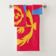 The Eritrea flag is a gold emblem in a red triangle, flanked on the top and bottom by green and blue triangles. The used colours in the flag are blue, green, red, yellow. The proportion of the Eritrea flag is 1:2. The Flag of Eritrea was adopted in 1993. The first use of the current flag design was in 1993. The last change to the current Eritrea flag design was in 1995.