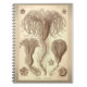 This notebook incorporates a full page from famed artist Ernst Haeckel's beautiful and highly-detailed work "Kunstformen der Natur," published in 1904. Plate 20 features a series of crinoid drawings, with a prominent sketch of crinoids from the Sacacrinus and Endoxocrinus genera (also known as Metacrinus and Pentacrinus, respectively). Although they look like plants, crinoids are marine animals consisting of a feathery head attached to the seafloor by a stalk. They are more colloquially known as sea lillies or feather stars. Ernst Haeckel's now public domain artwork is renowned for its meticulous detail and beauty.