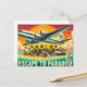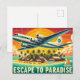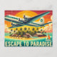 Here’s an enhanced vintage travel postcard featuring a sleek airplane flying over a tropical island with golden beaches, palm trees, and turquoise waters, now with more island details. ✈️🏝️🌅 The scene includes a luxury resort with cabanas, sailboats near the beach, and colourful coral reefs visible through the clear water. The bold 1950s-style typography reads "Escape to Paradise.