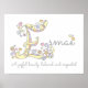 Pretty E monogram art name poster perfect for a girls bedroom or playroom in shades of grey, white, yellow, pink and purple. Personalize with your child's own name beginning with E, and name meaning for a truly personalized touch to your child's bedroom or nursery, this example is for the name E Esmae A joyful beauty, beloved and respected. Cute poster print ideal for a new baby, christening or baby shower gift. © Unique Capital E monogram hearts and flowers drawing description and graphic art design by Sarah Trett. www.sarahtrett.com for www.mylittleeden.com