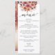 Dégustez vos invités avec cette carte de menu exquise en espagnol. Egalement disponible en anglais. Concevez la coordination de nos invitations à l'événement Rose Gold. Disposez le design avec sur le dessus une disposition florale unique en couleur rousse, rose rousse, pêche et champagne et sur le fond votre nom et votre date. Détail de typographie de script manuscrit. De retour dans un bouquet rose or brillant motif et fleuri sur le dessus.