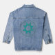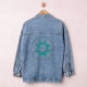 Cette veste en denim pour femmes a une conception amérindienne inspirée de triangles qui se chevauchent pour former un cercle avec un cercle plus large autour en l'honneur du mois du patrimoine amérindien.