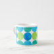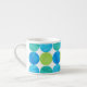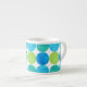 An Espresso Coffee Mug with a pattern of blue and green 'moons on a white background, from a handpainted paper collage by Judy Adamson.