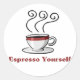 A steaming cup of coffee with Espresso Yourself under it. You enjoy coffee, why not let the world know it.
