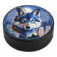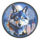 Beau loup aux yeux jaunes, avec des Dreamcatcters amérindiens, dans un paysage et Pleine lune de montagnes Bleues Sauvages. Logo original Vector Round Design isolé sur blanc Copyright BluedarkArt TheChameleonArt.