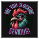 Un coq aux couleurs vives apparaît avec une expression d'incrédulité, entouré de l'expression "Êtes-vous en train de Clucking Serious!" en gras. Le design utilise des couleurs vives contre un arrière - plan sombre pour créer un effet frappant et humoristique.