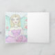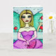 Congratulations Card beautiful illustration done in mixed media of a beautiful blonde girl and female, sitting in the middle of a natural fantasy landscape. Dress elegant violet dress, wearing gloves of the same colour and a fan in hand.