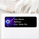 Un rendu fractal bleu et violet tourbillonnant d'une étoile de David suggérant la nature extrêmement chaude de la matière au moment de la création. Le même design se retrouve sur les invitations, les cartes et les envois.