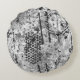 This throw pillow features an eclectic abstract that includes circles of zebra stripes. The colours range from grey (or grey) to charcoal to black.