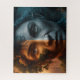 A captivating dark fantasy painting of a woman's face divided into two contrasting halves. The left side brims with youth and vitality in warm hues, while the right side reflects the wisdom of age in cooler tones. The expressive eyes, central to the artwork, highlight the journey through time, creating a mesmerizing cinematic scene.