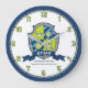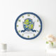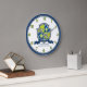 Knights style shield monogram letter E graphic art name meaning numbered wall clock. Coat of arms style design perfect for a boys bedroom or playroom in shades of green, blue white and grey. Personalize with your own name and name meaning for a personalized touch to your child's bedroom or nursery, this example is for names with the initial letter of E. Currently reads Ethan Strong and resolute. Impulsive, kind and long-lived. Ideal for a gift to a new baby boy, for a christening, baby naming or baby shower gift. Unique shield drawing, graphic art, name research, wording and design by Sarah Trett. www.sarahtrett.com for www.mylittleeden.com