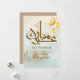 This card features a dreamy, light blue watercolor background with a subtle mosque silhouette and glowing golden lanterns paired with a crescent moon. Perfect for a spiritual and artistic Eid greeting