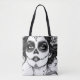 A stunning tote bag featuring a vibrant portrait of a woman in intricate Day of the Dead makeup on one side and a stylish gradient stripe design transitioning from nearly white to black on the other. Perfect for carrying essentials with a touch of art and elegance, blending cultural beauty with modern minimalism.