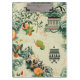 The picture shows a stylish, minimalist pattern, combining lush green leaves and juicy orange fruits, which rest on a soft, undulating background. Two elegant temple structures harmoniously emerge from nature, radiate peace and spiritual depth. The palette of green, orange and cream colors gives freshness and serenity, inviting to contemplation and inner peace.