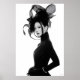 Make a striking statement with this captivating black and white art print, a true masterpiece of avant-garde fashion and artistic expression. This compelling frontal portrait features a woman of intense allure, crowned with an extraordinary, sculptural black hat crafted from sheer, intricate fabric, creating an ethereal and dramatic silhouette. Dressed in a sleek black turtleneck with elegant drapes and long gloves, her minimalist attire is accented by a subtle silver bracelet. Her pale skin, stark dark lips, and piercing gaze with dramatic winged eyeliner create a mesmerizing contrast against her dark ensemble and the pristine white background, emphasizing her powerful and direct presence. With a confident and enigmatic expression, this artwork embodies a fierce, mysterious, and undeniably chic elegance. Perfect for modern living spaces, fashion studios, or any decor seeking a touch of unique sophistication, bold artistry, and a truly unforgettable visual narrative.