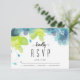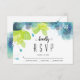 Blue and teal ethereal flowers floral spring wedding RSVP card. The upper part is covered with a bouquet of blue flowers with green leaves.