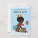 Elegant custom personalized vintage ethnic prince baby shower thank you card template for African American baby boys with a beautiful vintage illustration of a cute and adorable baby boy with stylish blue diaper and gold crown. He is ringing you on an old red retro telephone to say thank you. He is holding a little blue suitcase and his quirky teddy bear is leaning against it - he's all packed up and ready for his arrival! The background is a pretty blue with a classy, modern, contemporary blue chevrons border with grey text. Chic, trendy, fun, fashionable, funny, amusing, humourous, whimsical, affordable personalized / personalised custom baby boy shower thank yous templates. Decorated on both sides. The back / reverse side has the same design. Double sided printing / front and back. You can hand write your message on the back. If you need any assistance customizing your product please contact me through my store and I will be happy to help.