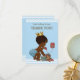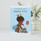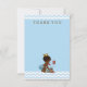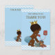 Elegant custom personalized vintage ethnic prince baby shower thank you card template for African American baby boys with a beautiful vintage illustration of a cute and adorable baby boy with stylish blue diaper and gold crown. He is ringing you on an old red retro telephone to say thank you. He is holding a little blue suitcase and his quirky teddy bear is leaning against it - he's all packed up and ready for his arrival! The background is a pretty blue with a classy, modern, contemporary blue chevrons border with grey text. Chic, trendy, fun, fashionable, funny, amusing, humourous, whimsical, affordable personalized / personalised custom baby boy shower thank yous templates. Decorated on both sides. The back / reverse side has the same design. Double sided printing / front and back. You can hand write your message on the back. If you need any assistance customizing your product please contact me through my store and I will be happy to help.