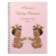 Personalized elegant ethnic vintage princess twins baby shower guestbook. A beautiful vintage illustration of two cute and adorable African American baby girls with stylish gold Princess crowns, pearl earrings and necklaces and bows in their hair on a chic pastel pink quilted pattern with pearls background with customizable text. If you need any assistance customizing your product please contact me through my store and I will be happy to help. PLEASE NOTE: These are flat printed graphics - no raised parts. I have matching products in my store.
